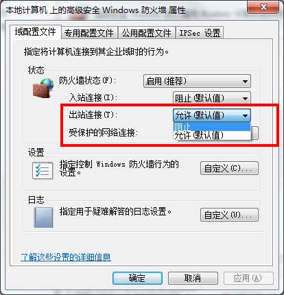 3、将出站规则修改为阻止,然后保存退出