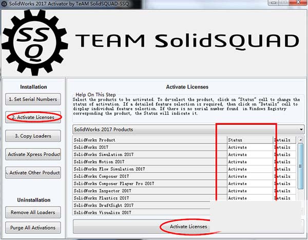 6、点击左边的“2.Activate Licenses”,确认Status项中的值都是“Activate”,然后点击“Activate Licenses”,弹出窗口点击“NO”