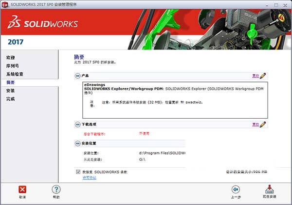 10、进行Solidworks2017安装功能和安装目录等设置,设置完成后勾选接受条款,点击“开始安装”