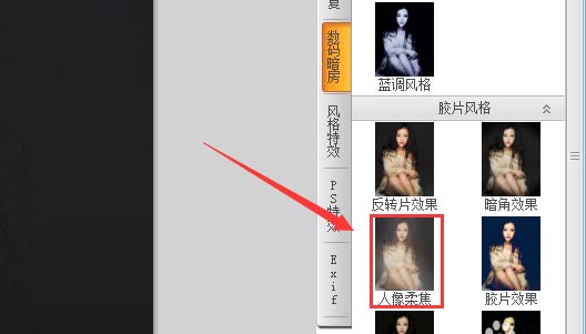 6、点击数码暗房选项,在其内找到人像柔焦选项,如图所示: