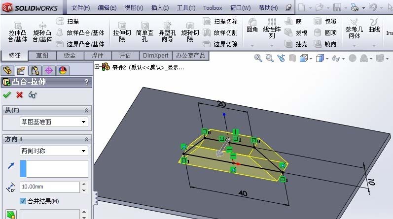 4、上视基准面对称拉伸一个桥型特征,然后确定。
