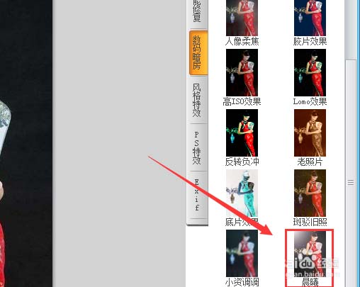 6、点击数码暗房选项,在其内找到晨曦选项,如图所示: