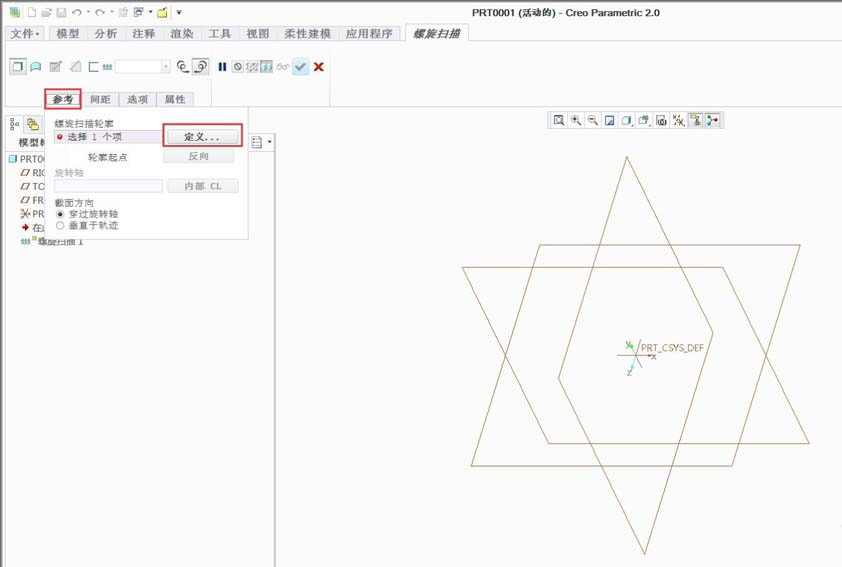3、进入到螺旋扫描的操作界面,点开参考菜单,按下图指示点击定义,选择一个基准面作为绘图平面,其它默认设置。