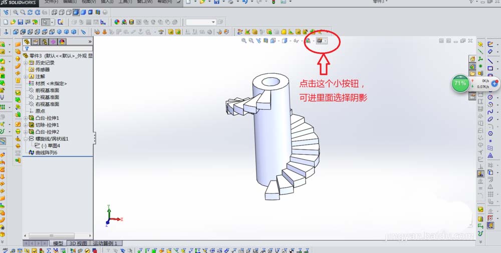 3、点击“视图”-“显示”-“在上色模式下加阴影”,即可给零件添加阴影,如下图