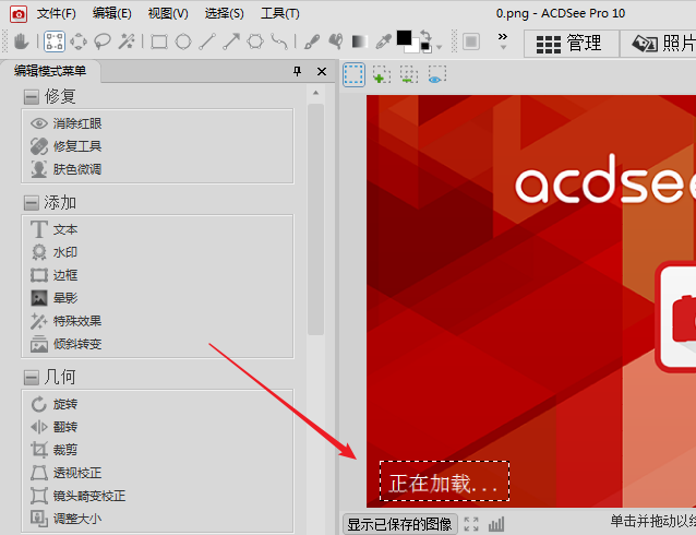 3、我们使用acdsee看图软件的选区工具将图片上要打马赛克的地方做好选区,这里将“正在加载”几个字选中给大家演示。
