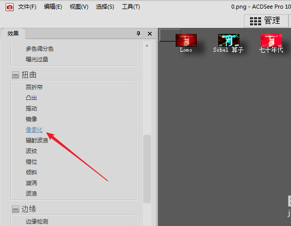 5、在acdsee看图软件的特殊效果中我们找到扭曲功能,其中有像素化功能,熟悉ps的朋友基本都知道,acdsee自身的编辑功能也相当的强大。