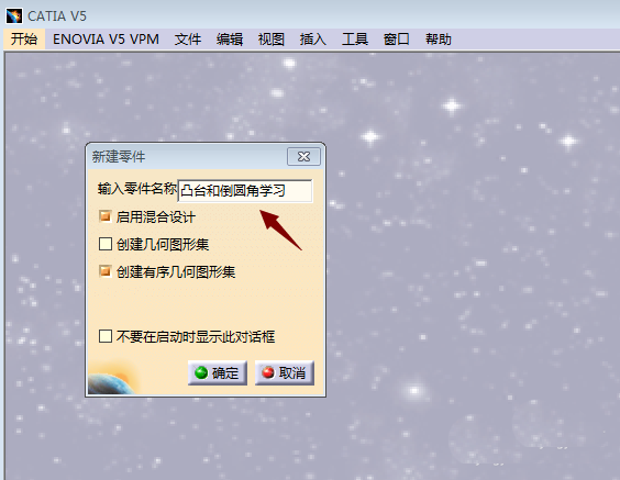 1、打开CATIA软件,选择零件设计模块,对模块零部件进行命名,如图所示,点击确定进入到操作界面。