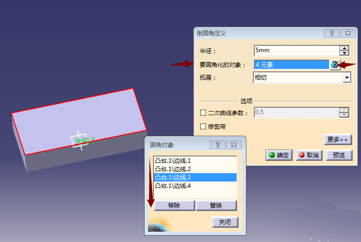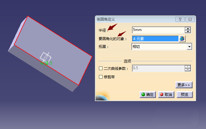2、点击倒圆角命令,弹出倒圆角对话框,然后对圆角半径和倒圆角元素进行定义,然后点击预览对倒圆角进行确认,没问题点击确定,完成倒圆角操作。