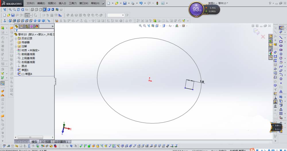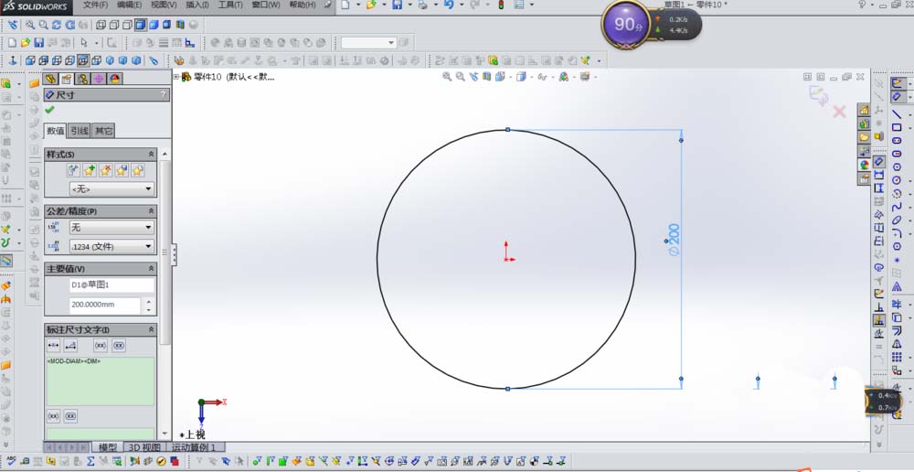 1、打开SolidWorks软件,并在上视基准面上画出一个直径200的圆,如下图
