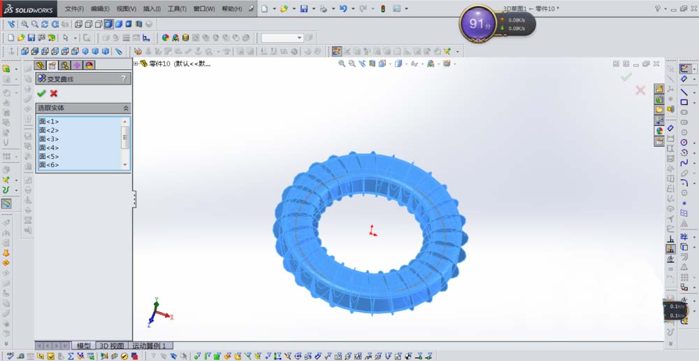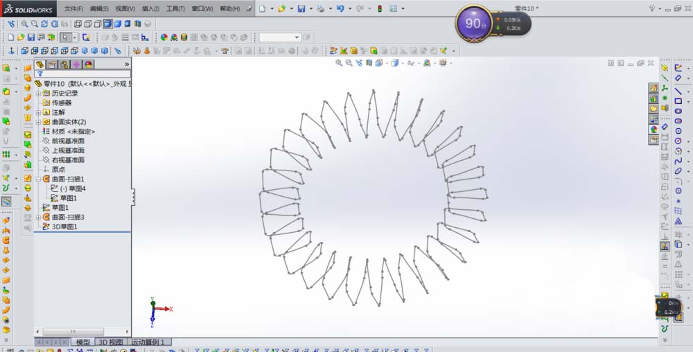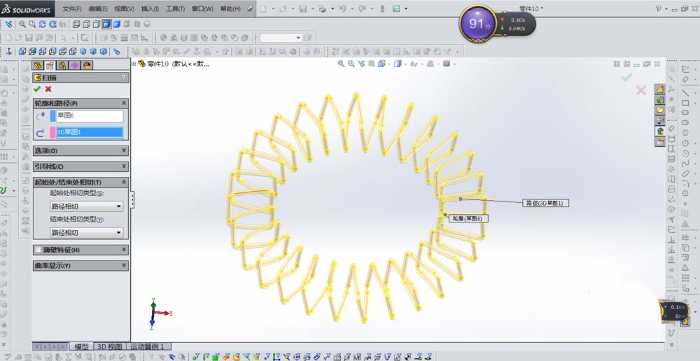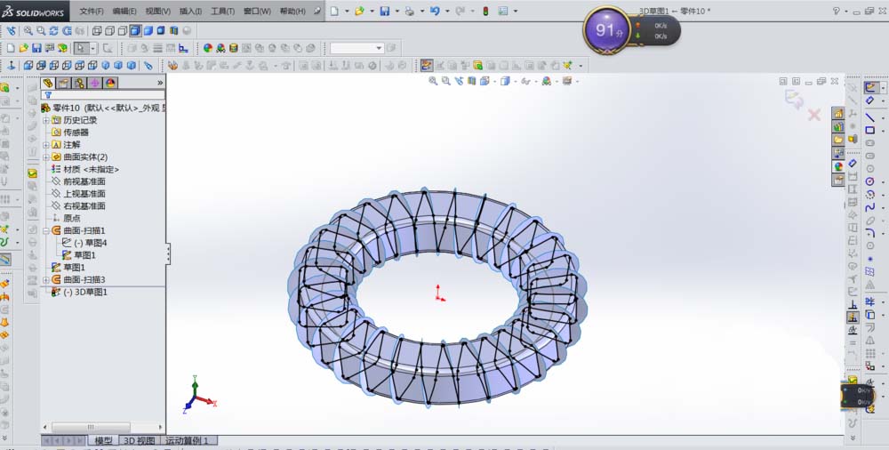 9、把刚才做的第二个曲面扫描显示出来,便得到了我们需要的沿圆环螺旋线,如下图