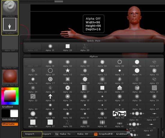 3、设置笔刷。在左侧导航栏将笔刷类型设置为Standard[标准]类型,路径方式设置为DragRect[拖拽];点击Alpha Off[笔刷通道关闭]>Import[导入],选择准备好的浮雕灰度图导入。