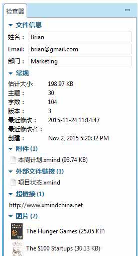 2、从信息中我们可以看到,通过检查视图可以查看文件信息,包括导图中的图片、链接等主题元素,此外,你还可以看到这个导图有多大,一共有几个分支,什么时间创建或被修改的,以及其他一些常规信息。