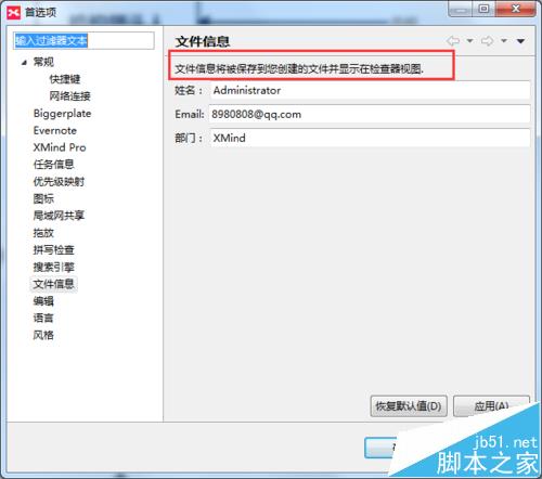 注释:所填写的文件信息将会被保存到我们创建的文件中,并且可以显示在检查器视图中。如果想要取消文件信息,只要点击恢复默认值就会回到XMind默认状态。