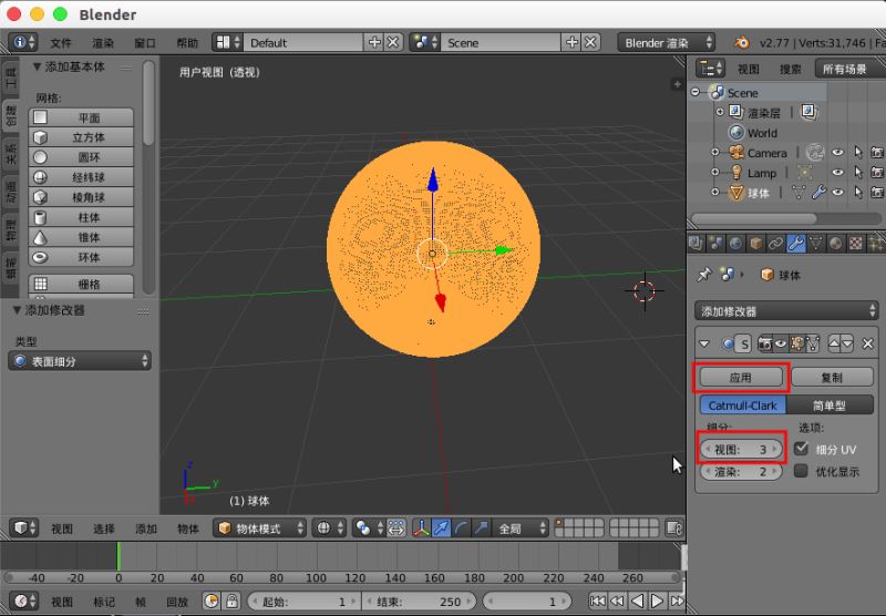 2、右边属性导航选择“修改”,给球体添加“表面细分”修改器。