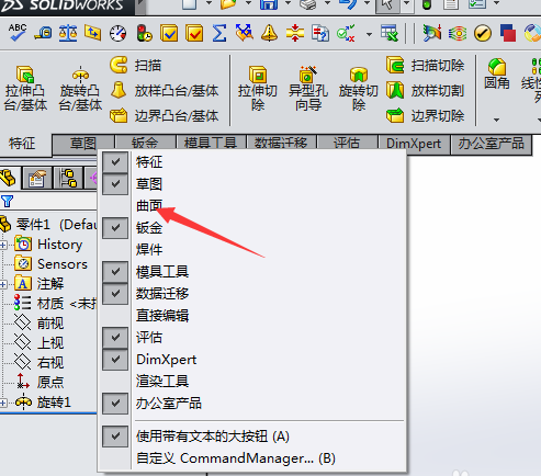 2、如下图所示在工具栏找到曲面选项并点击进入曲面命令界面,如果工具栏没有曲面一项,那么将鼠标放在特征或草图任意一项上右键即可看到下拉菜单中有曲面项,打勾后曲面命令就会出现在工具栏上。