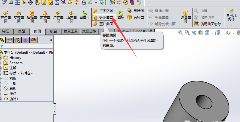 3、进入曲面命令后,工具条如下图所示,找到等距曲面并单击