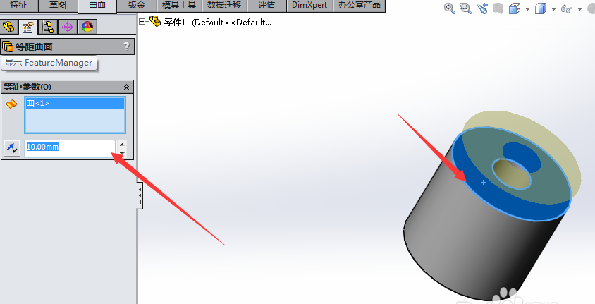 4、单击圆柱上表面,如图中所示,选中后变成蓝色。并在左边将等距距离改为0