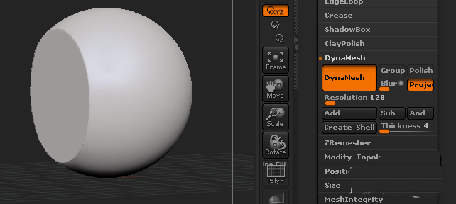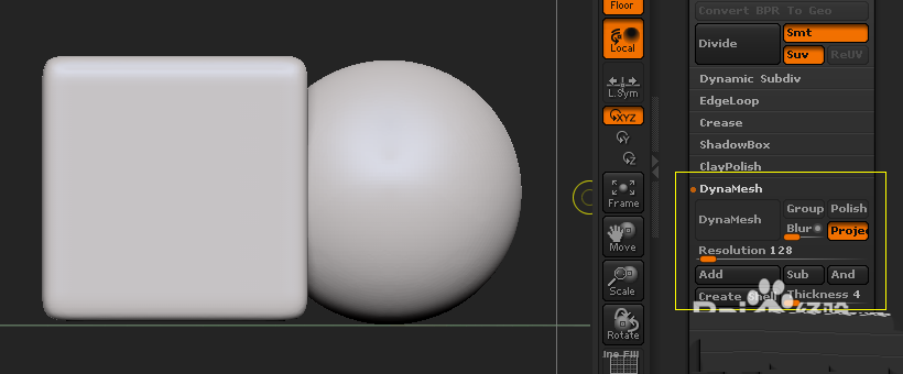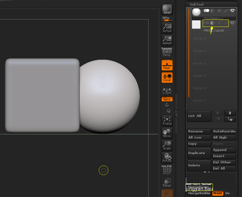 第一个SubTool是模型本体,也就是属于布尔运算的A(方体),第二个就是属于B(球体),A的模式基本上是不用动的,主要在于B的模式。先把B模型的模式选对,然后选中A MergeDown把两个模型合并起来;再点Geometry的DynaMesh(注意两个模型的面数细分一定要够多,不然切出来还是锯齿)。