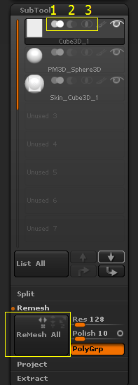 第一个SubTool是模型本体,也就是属于布尔运算的A(方体),第二个就是属于B(球体),A的模式基本上是不用动的,主要在于B的模式。先把B模型的模式选对,然后选中A Remesh All把两个模型进行复合运算。