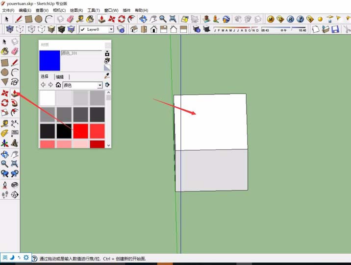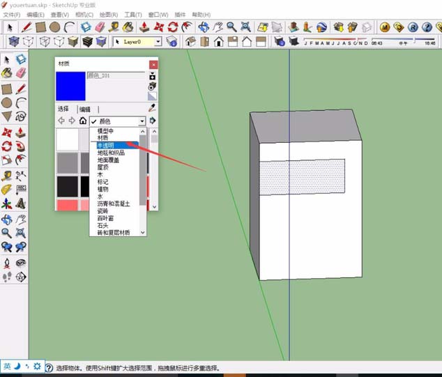 6、确定体块以及窗户的大小位置之后,即可进行材质的填充,点击SketchUp左侧的“材质”命令,系统会自动弹出材质的小窗口,我们可以选择合适的材质和颜色。