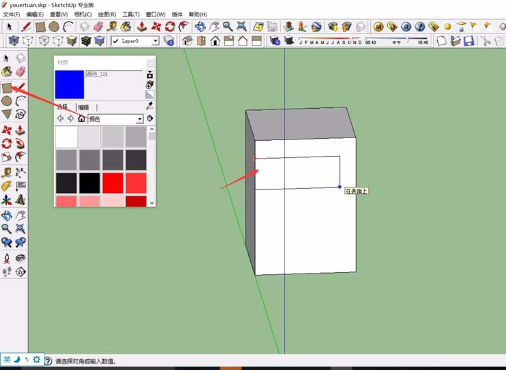 5、随后我们调整视角到合适的位置,再次选择矩形工具,在我们绘制的体块上绘制我们需要添加窗子的矩形,矩形的大小和窗户大小一致即可。