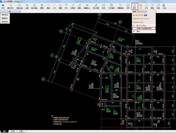 1、打开CAD快速看图,点击“账号”按钮登录自己的快速看图账号。如果你是VIP会员,那么会在账号按钮里出现一个按钮“申请VIP功能离线使用”。如果你不是VIP会员,那么没有这个按钮。