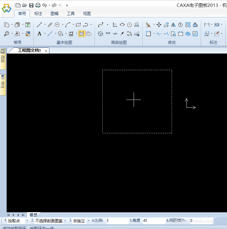 3、在基本绘图中找到剖面线指令,在左下角输入你的剖面线的角度和比例,这里已45度,比例为3为例。