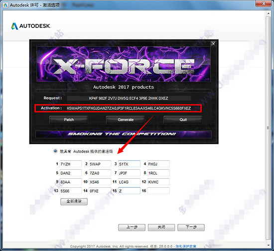 11、回到激活界面,将“申请码”复制到注册机的第一项中,点击“Generate”,生成激活码