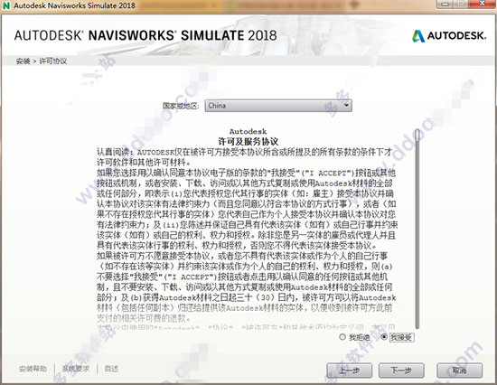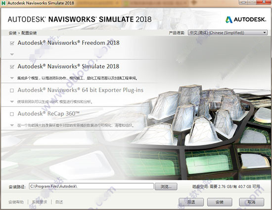 4、我们可以看到在安装包中除了NavisWorks Manage 2018还包含了NavisWorks Freedom2018,选择安装功能以及安装目录,点击“安装”