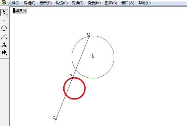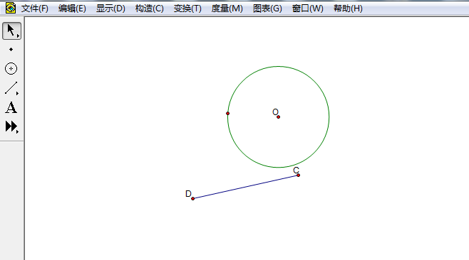 3、制作动点轨迹动画。今天我要教你如何制作,一端点固定,另一端点在一个定圆上运动的线段中点的轨迹动画。先画出定圆O和线段DC,D是顶点,C是动点。