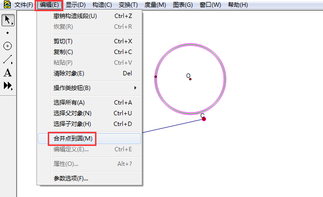 4、选中圆O和点C,单击编辑---合并点到圆。这样就能够保证点D运动时,始终在圆上。