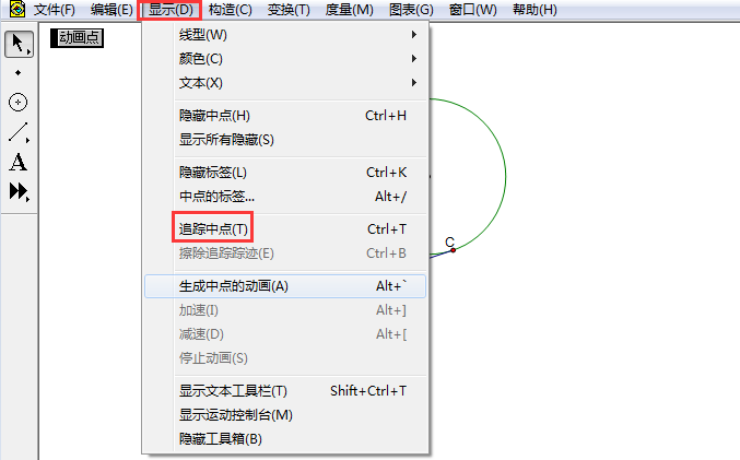 2、如何留下点的运动轨迹呢?这就要用到追踪工具。选中点,单击显示---追踪点。现在单击动画按钮,点动的同时也留下了轨迹。这就是所谓追踪功能。