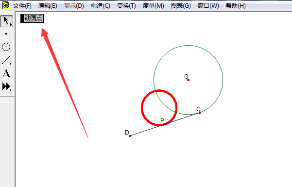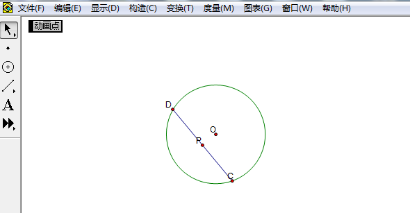 5、构造线段中点。选中选段CD,单击构造---中点,利用标签工具给中点打上标签P。