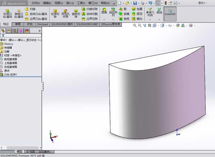 2、点击拉伸凸台命令,选取任意的视图平面,然后绘制草图,利用样条曲线和直线绘制草图,然后退出草图,设置拉伸深度,点击打勾完成拉伸。