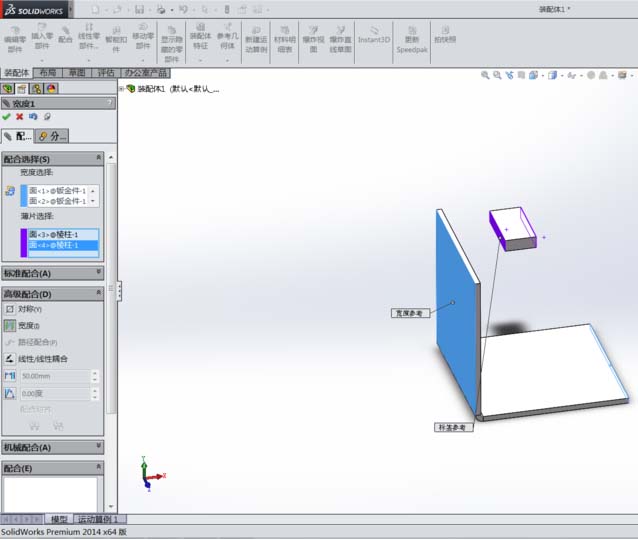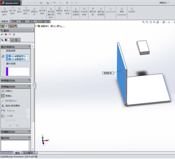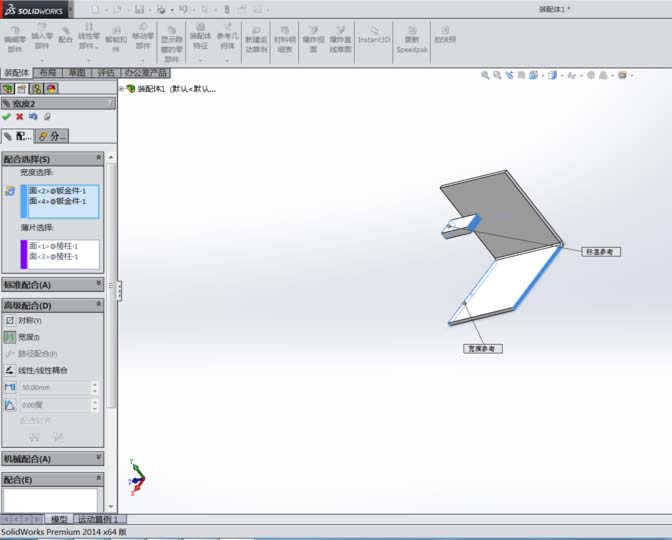 1、零部件配合:单击配合,左侧出现配合对话框,选择高级配合并展开,选择宽度。