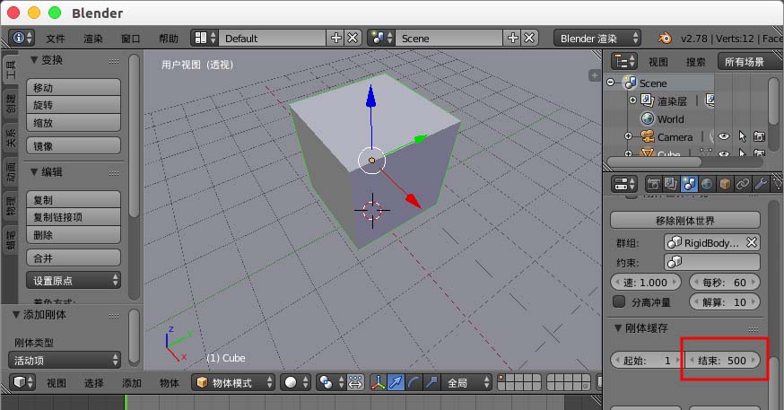 blender默认动画只模拟250帧,像路径动画、物理刚体动画都只有250帧,其实我们可以自己设置帧的数量,可以设置大于或者小于这250帧数。