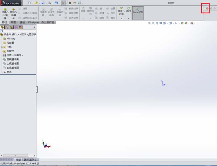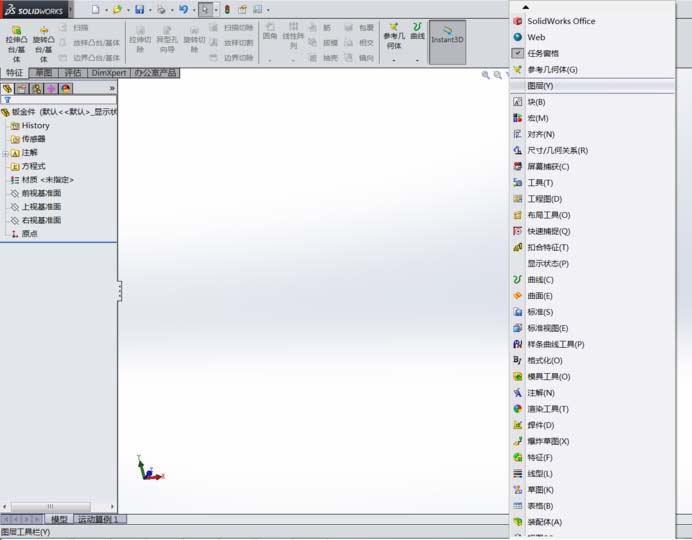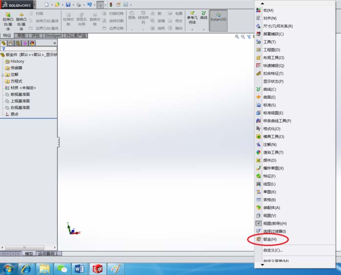 2、调出钣金命令栏:将鼠标光标定位在工具栏并右键单击,界面会自动跳出工具选择。单击向下按钮,找到钣金,左键单击钣金,界面自动跳出钣金工具栏。