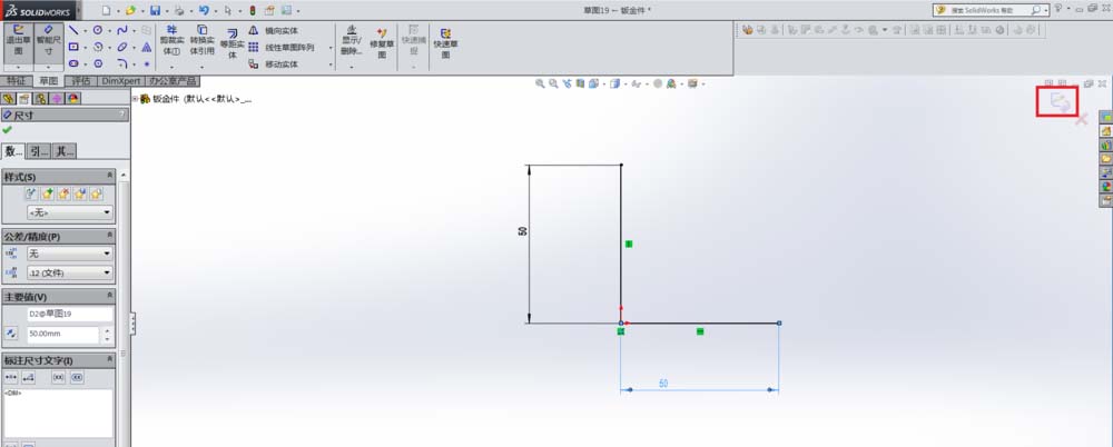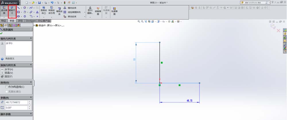 6、草图尺寸定义:单击智能尺寸,编辑直线长度。(光标定位在需要编辑尺寸的直线上,单击拖动鼠标,更改长度后单击“√”)
