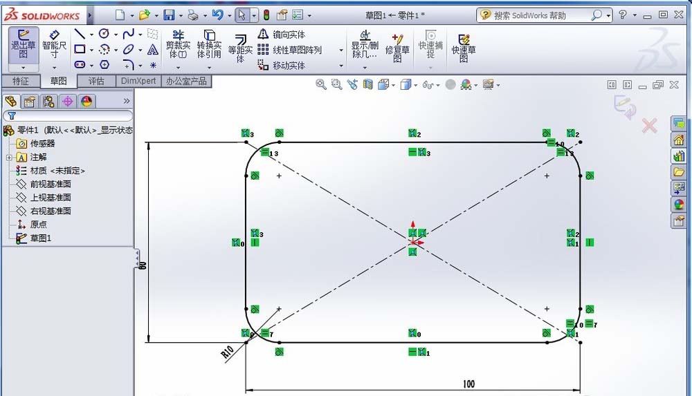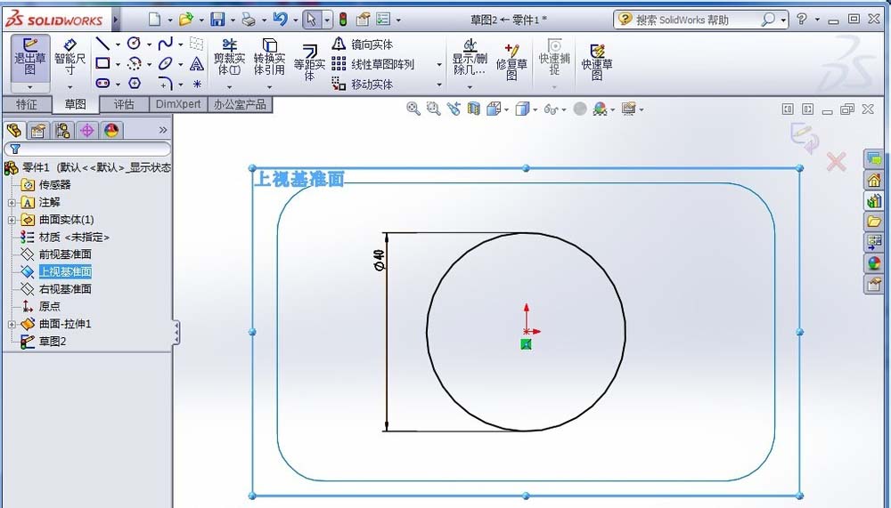 1、在上视基准面建立矩形草图,确定好尺寸并进行倒圆;