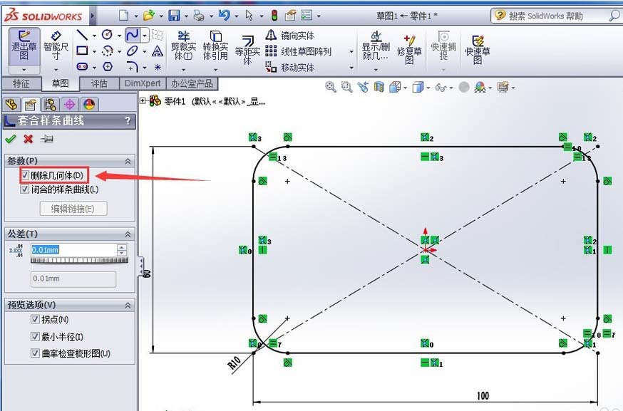 2、点击“样条曲线”里面的“套合样条曲线”,勾选“删除几何体”,然后用鼠标依次点击草图中的所有线段,然后确定并退出草图。这一步操作是将所画草图构成连续的曲线,为之后的连续曲面做准备;