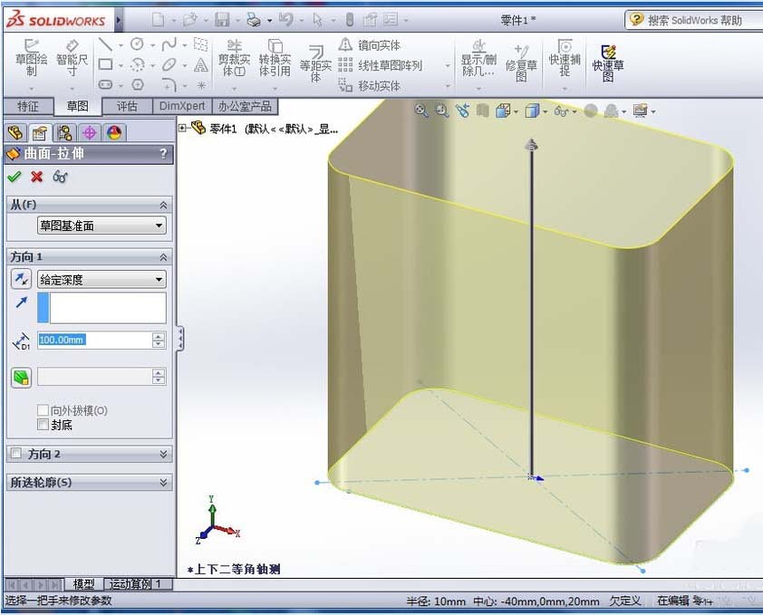 3、依次点击“插入”——“曲面”——“拉伸曲面”,选择上一步所画草图进行拉伸,拉伸时深度设定为弹簧轴向长度即可;