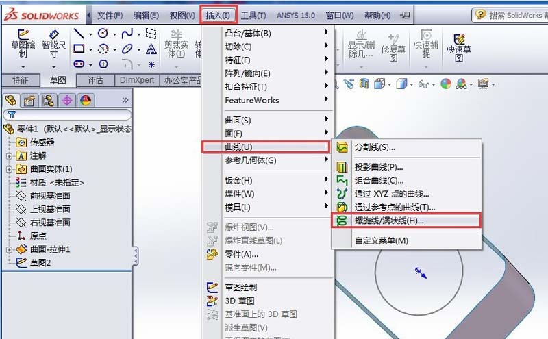 5、依次点击“插入”——“曲线”——“螺旋线/涡状线”,选取上一步画的圆开始建立螺旋线,设定好螺距、圈数等参数;