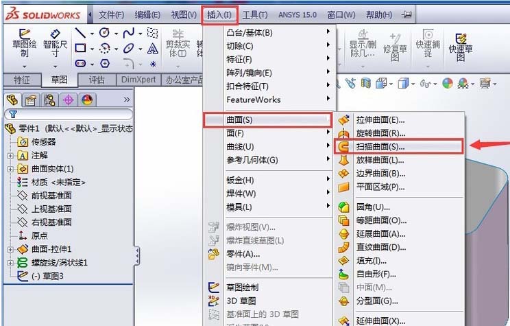 7、依次点击“插入”——“曲面”——“扫描曲面”,选上一步做所直线为轮廓,之前所做螺旋线为路径,建立一个螺旋面;