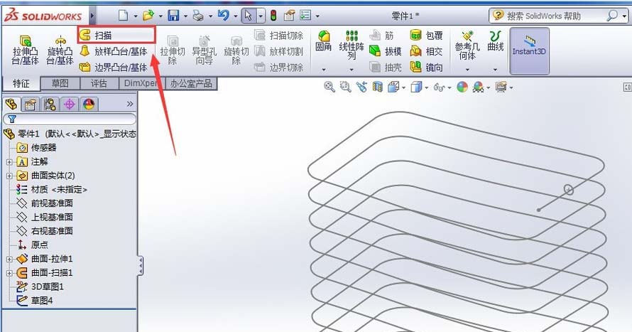 10、点击特征里面的“扫描”,选择上一步所做草图为轮廓,选择之前建立的矩形螺旋线作为路径,则所需弹簧的建模就完成了。