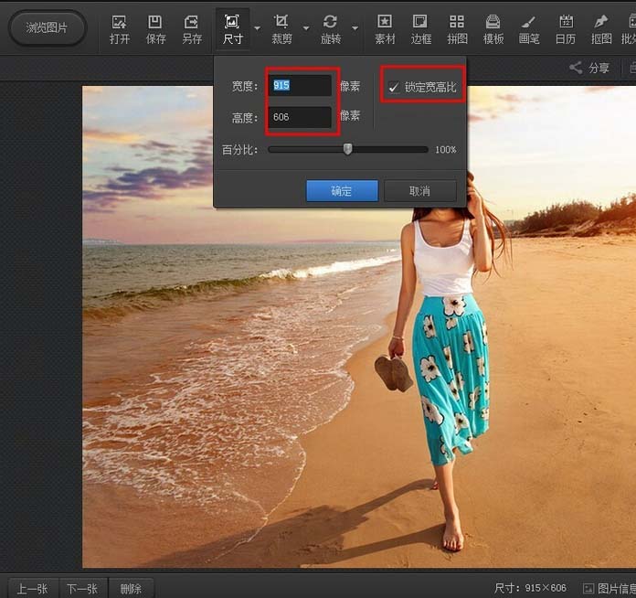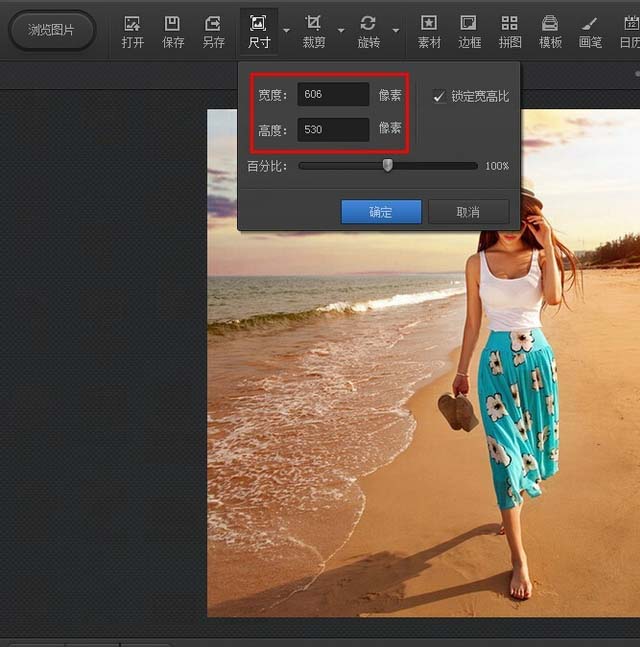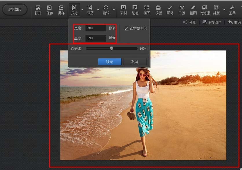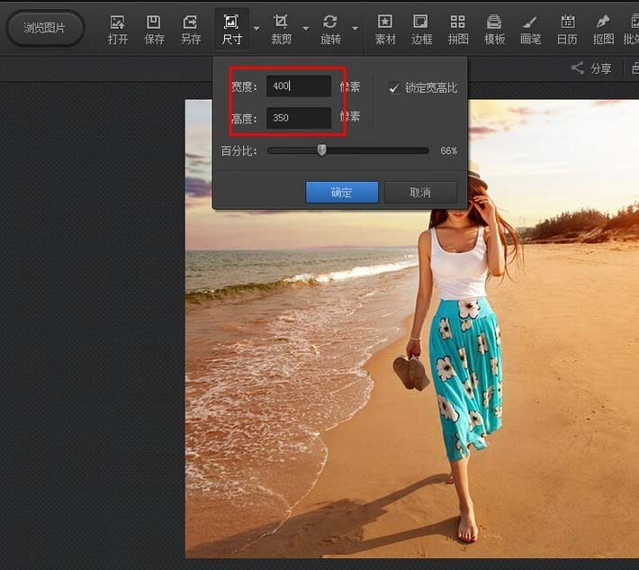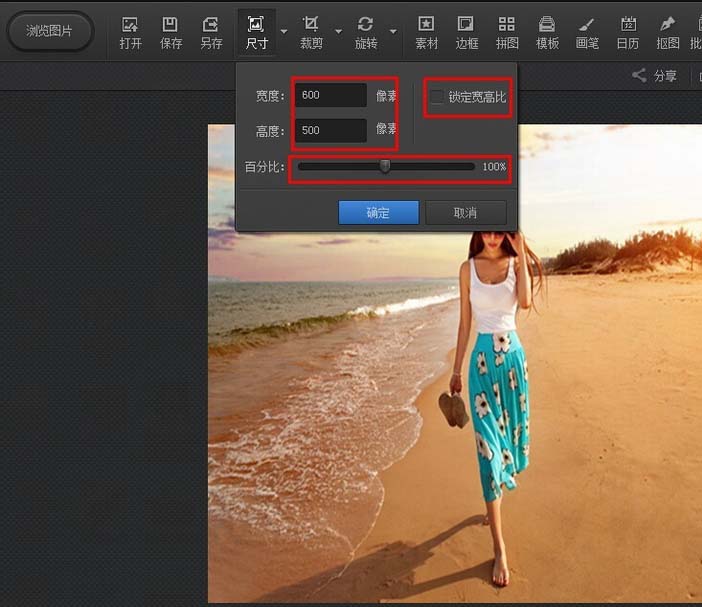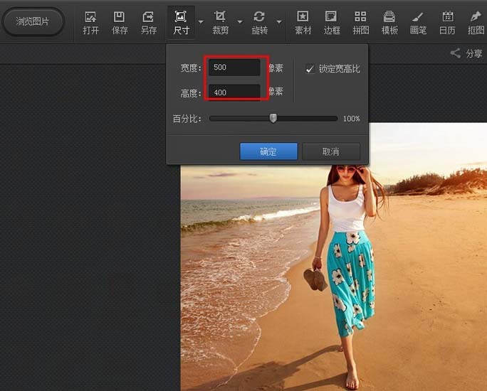 3、在“宽度”任意输入一个数字,高度也会随之改变,最后确定,即可完成一个最基本的操作。