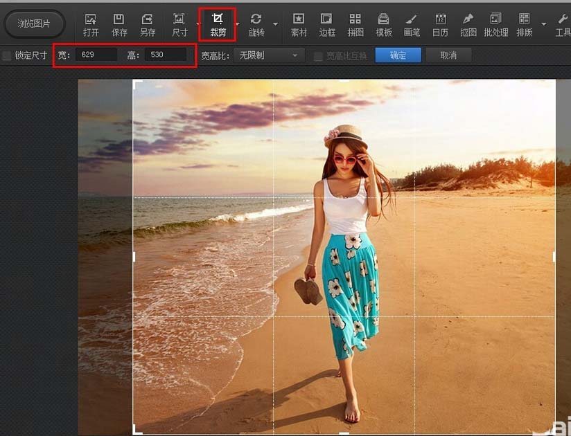 5、除了用到“尺寸”之后,也可以通过“裁剪”这一功能来改变图片的尺寸。点击“剪切”,在图片上任意裁剪,宽与高的数值会随之变化,调整到合自己的需要即可。