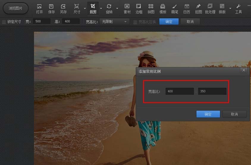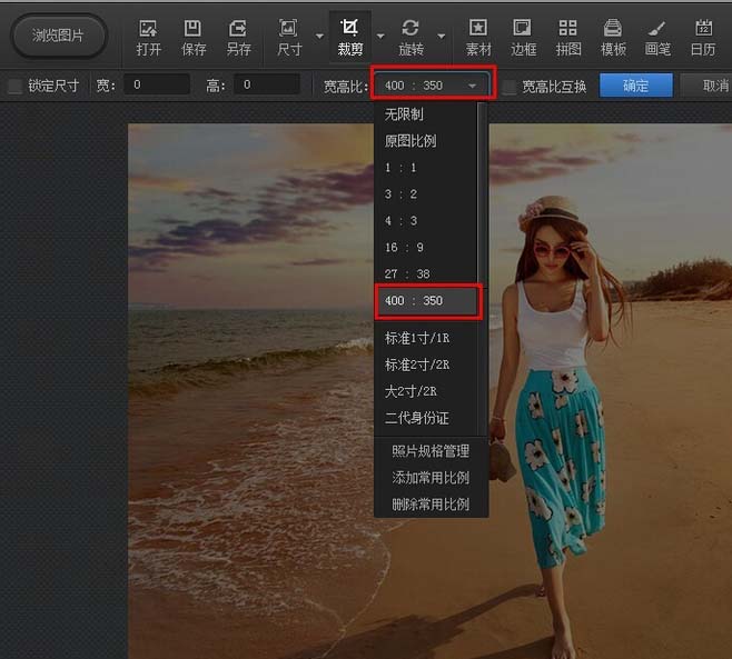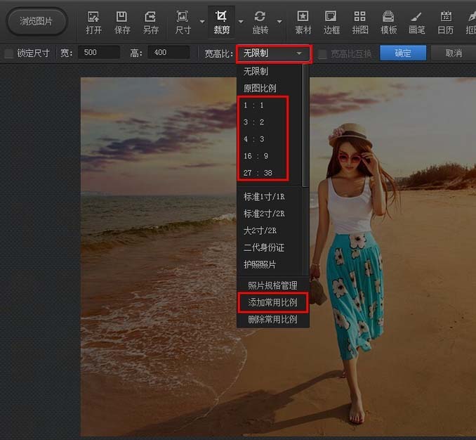 8、此外,可以点击“长宽比”的下拉框,选择合适的尺寸比例,如果没有的话,可以点击“添加常用比较”进行添加。
