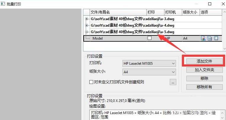2、待打开“批量打印”窗口后,点击“添加文件”或“添加文件夹”按钮以选择多个DWG工程文档或整个文件夹进行添加操作。