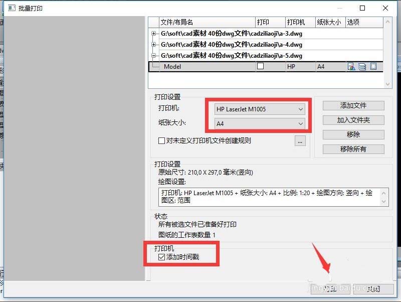 3、接下来就需要对打印选项进行设置,如图所示,可以选择想要使用的打印机,以及“纸张大小”,点击“打印”按钮即可批量打印DWG工程文件。