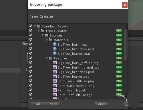 2、导入树木资源,确保你已经导入了树木资源,如果没有需要导入一下,导入系统自带的树木资源包步骤如下:光标放到Project视图中或直接右击Assets文件夹,在弹出来的列表中点击“Import Package”-->“Tree Creator”,如下图所示。